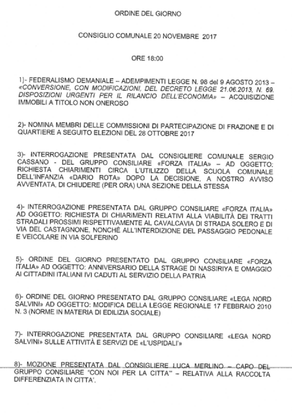 In allegato, l'ordine del giorno della seduta del Consiglio comunale di Lunedì 20 novembre, alle ore 18,00.