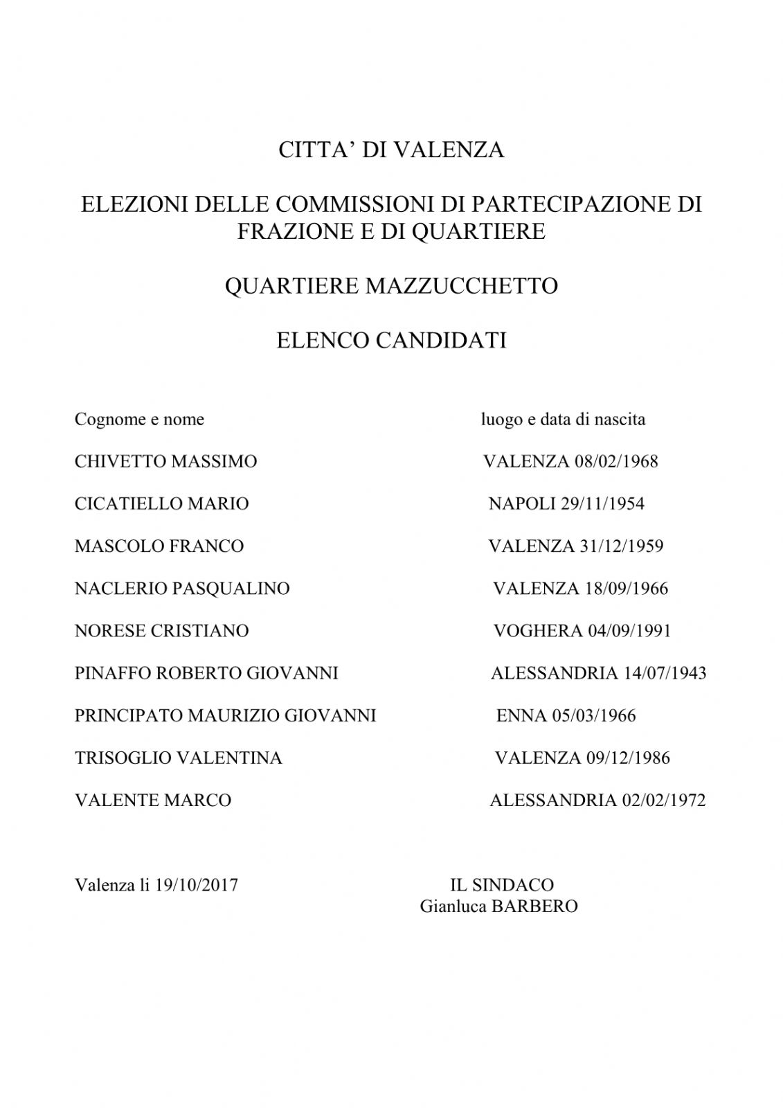 In allegato, l'elenco dei candidati per il Quartiere Mazzucchetto, alle Elezioni delle Commissioni di partecipazione, indette per Sabato 28 ottobre 2017, ai sensi dell'art. 6 del Regolamento comunale.