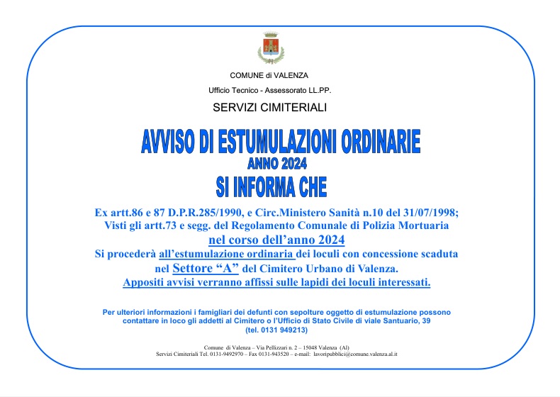 Si informa che: nel corso dell’anno 2024 si procederà all’estumulazione ordinaria dei loculi con concessione scaduta nel Settore “A” del Cimitero Urbano di Valenza.