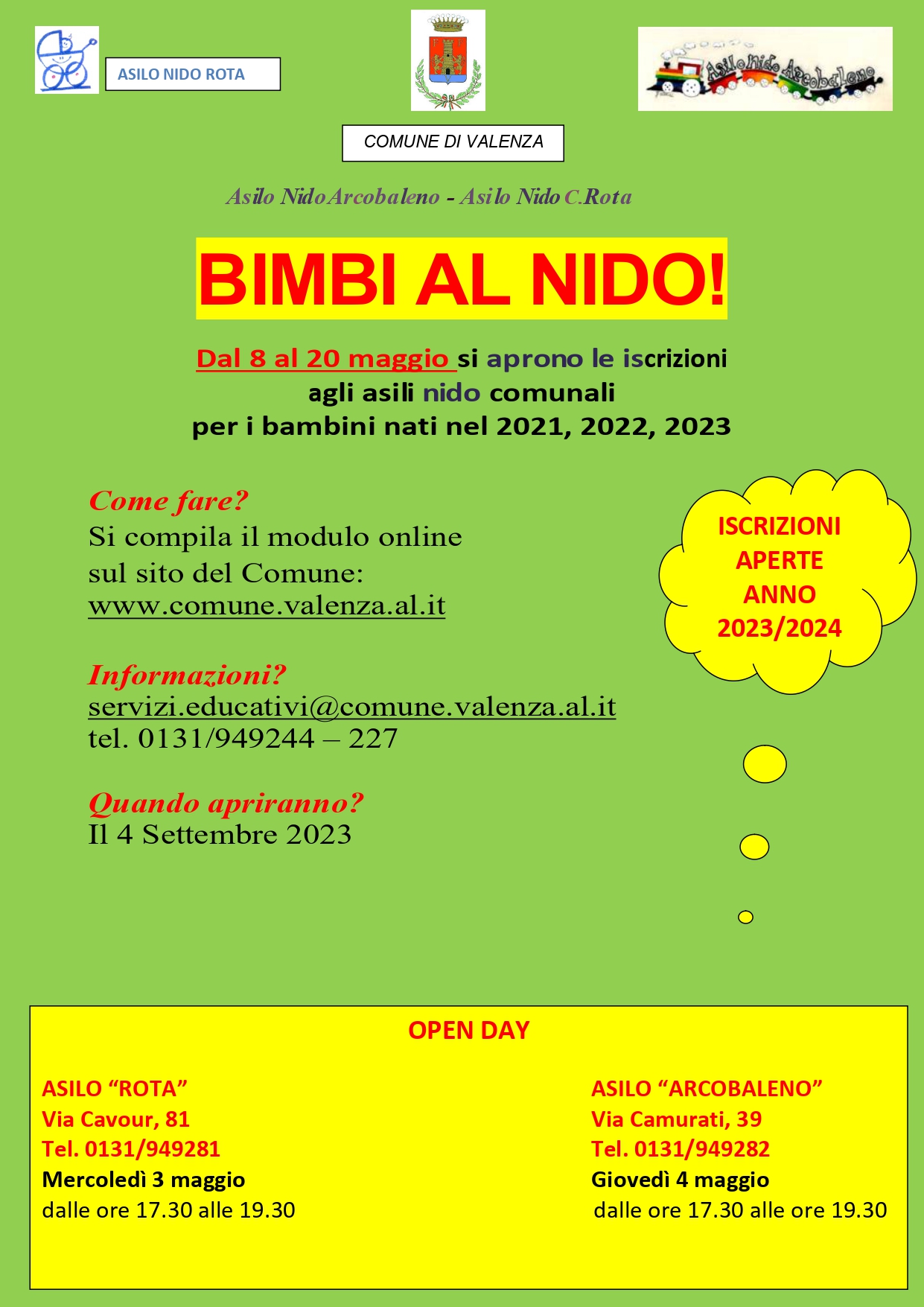 Si comunica che dal 8 maggio si apriranno le iscrizioni agli asili nido comunali “Arcobaleno” e “C. Rota” per i bambini nati nel 2021, 2022 e 2023.