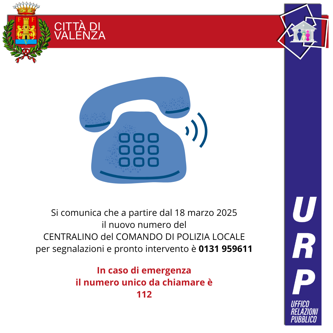 Si comunica che a partire dal 18 marzo 2025, il nuovo numero del CENTRALINO del COMANDO DI POLIZIA LOCALE per segnalazioni e pronto intervento è: 0131 959611