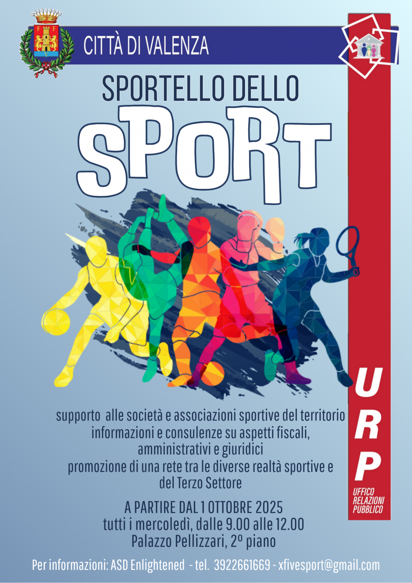 A partire dal 1° ottobre, tutti i mercoledì dalle ore 9.00 alle ore 12.00 presso la sede comunale di Palazzo Pellizzari, sarà attivo lo "Sportello dello Sport", un servizio dedicato a tutte le associazioni e società sportive di Valenza, per fornire loro supporto in diversi ambiti (amministrativo, fiscale, giuridico, assicurativo) e anche per favorire la creazione di una rete tra realtà del territorio.