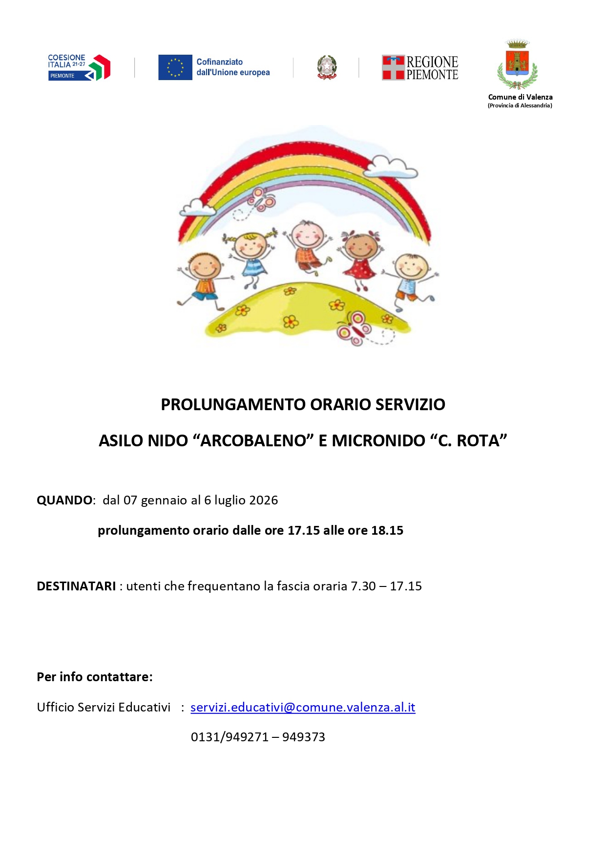 La Regione Piemonte, con Determinazione Dirigenziale n. 675/A1511D/2025 del 17/11/2025, ha assegnato al Comune di Valenza, risultato tra i beneficiari del finanziamento, un contributo, che consentirà di aumentare di un'ora a titolo gratuito, dalle 17.15 alle 18.15, l'apertura degli asili nido comunali "C. Rota" e "Arcobaleno".
