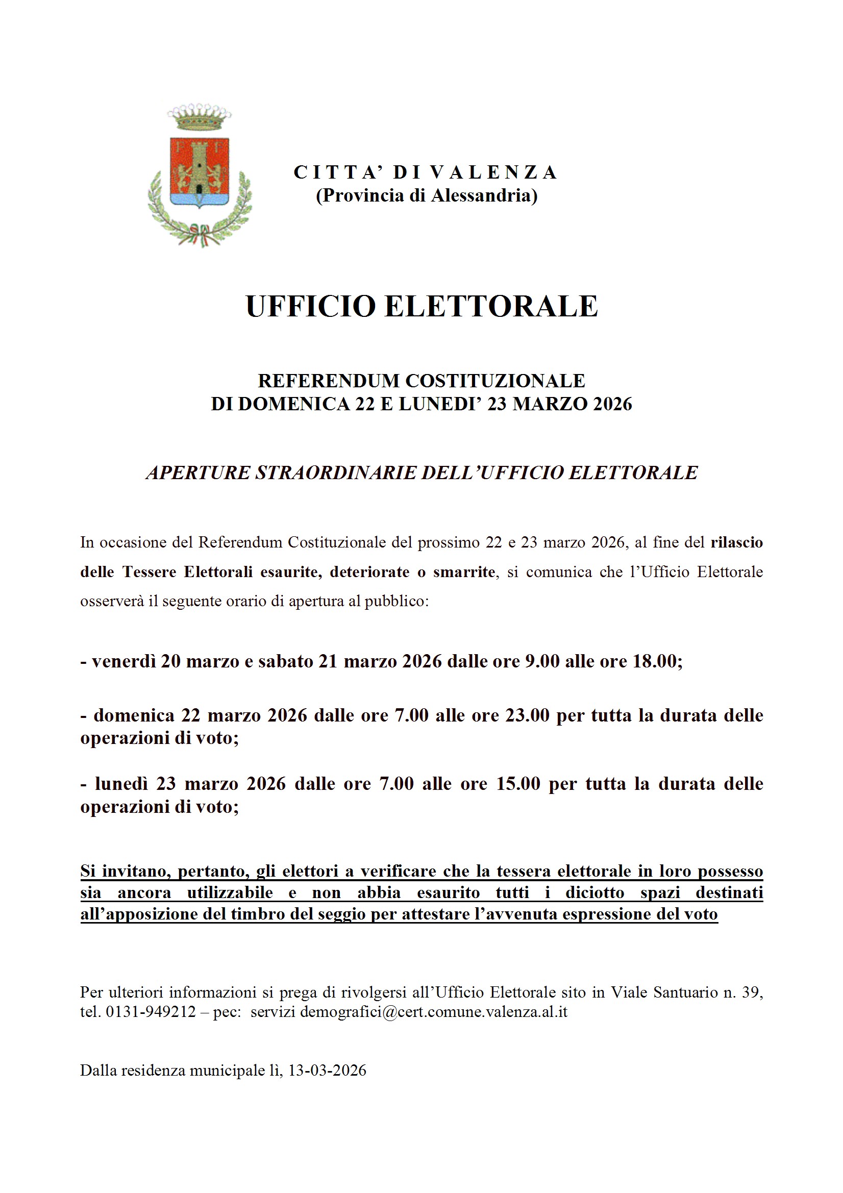Per ulteriori informazioni si prega di rivolgersi all’Ufficio Elettorale sito in Viale Santuario n. 39, tel. 0131-949212 – pec: servizi demografici@cert.comune.valenza.al.it