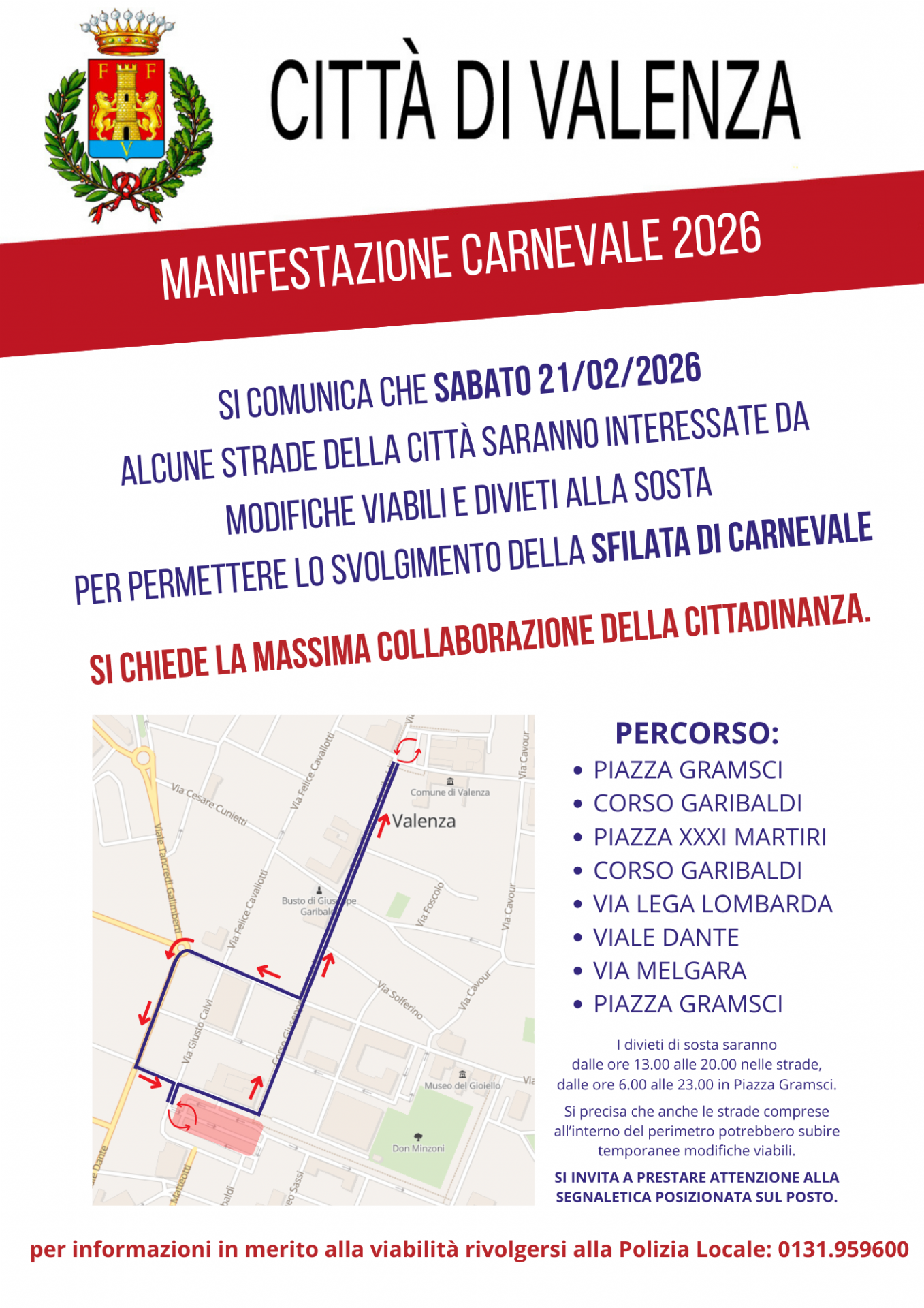Per informazioni in merito alla viabilità rivolgersi alla Polizia Locale: 0131.959600
