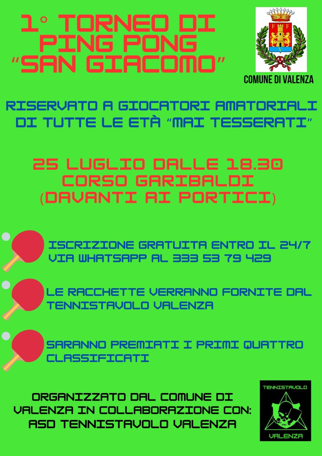 Giovedì 25 luglio, in Corso Garibaldi a partire dalle ore 18.30, avrà luogo il 1° Torneo di ping pong "San Giacomo" organizzato in collaborazione con la ASD Tennistavolo Valenza.