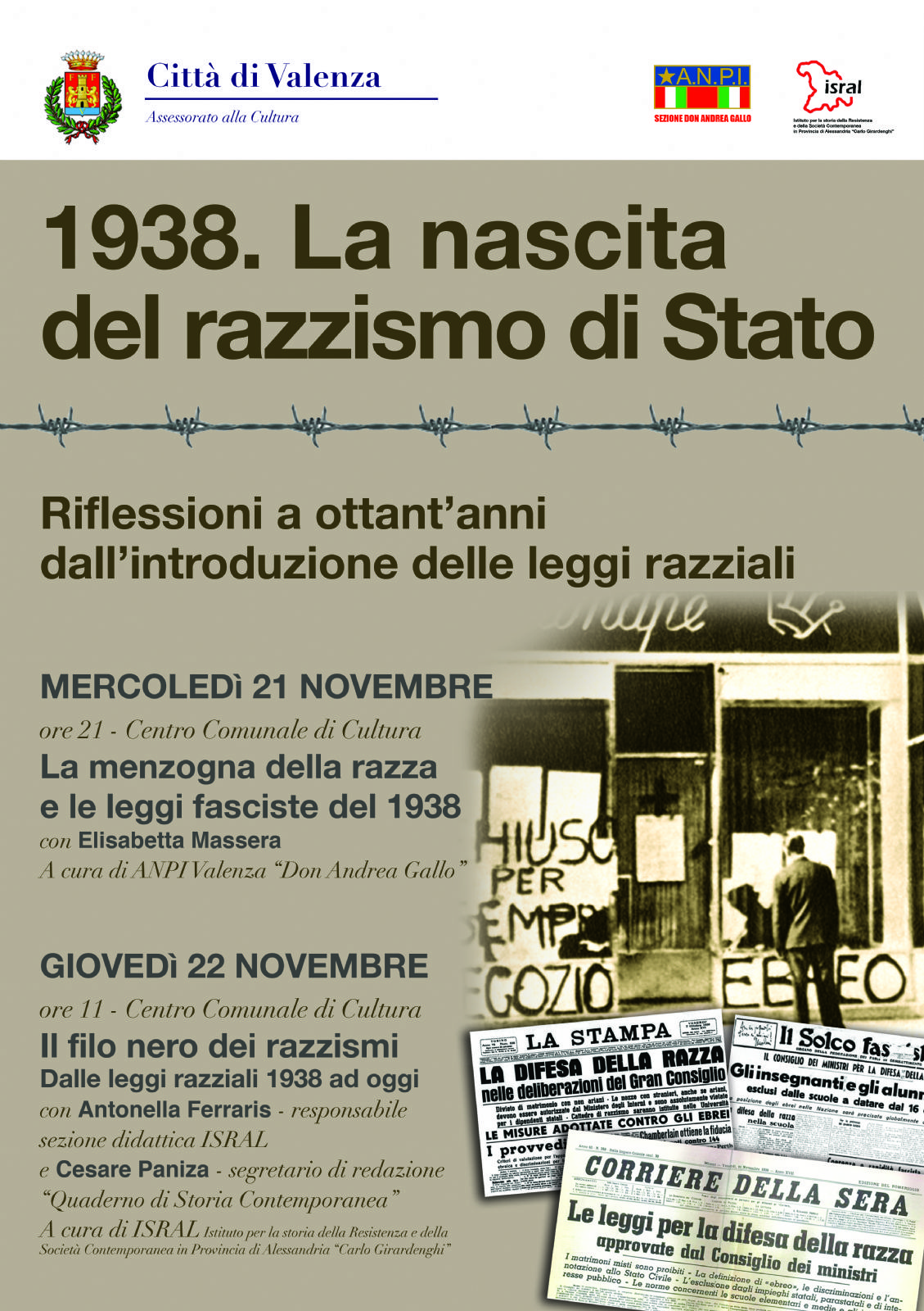 Mercoledì 21 Novembre alle ore 21 al Centro Comunale di Cultura di Valenza si svolgerà un incontro dal titolo "La menzogna della razza e le leggi fasciste del 1938" con Elisabetta Massera.
