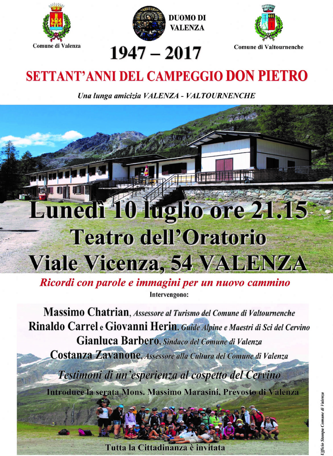 Lunedì 10 Luglio alle ore 21.15 presso il teatro dell'Oratorio Maschile di Valenza in V.le Vicenza, 54, ci sarà un incontro di parole e immagini per un nuovo cammino del Campeggio Don Pietro di Valtournenche.