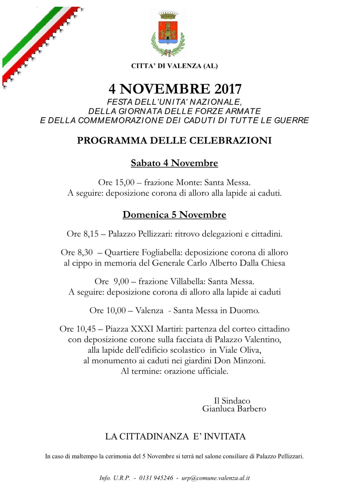 In allegato,, il programma delle celebrazioni per il 4 Novembre - Giornata dell'Unità nazionale e Festa delle Forze armate.
