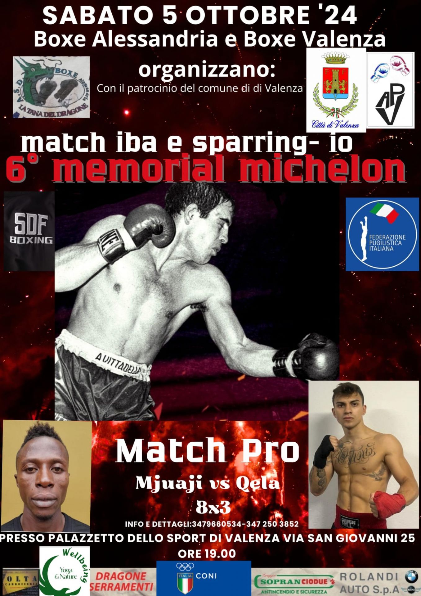 Alle 19.00, il 6° Memorial Michelon, una vera e propria manifestazione Pugilistica con atleti Valenzani e Alessandrini contro atleti provenienti da tutto il nord Italia (7/8 incontri), a seguire un match professionistico con il valenzano Leonardo Qela contro il colombiano Mjuaji.