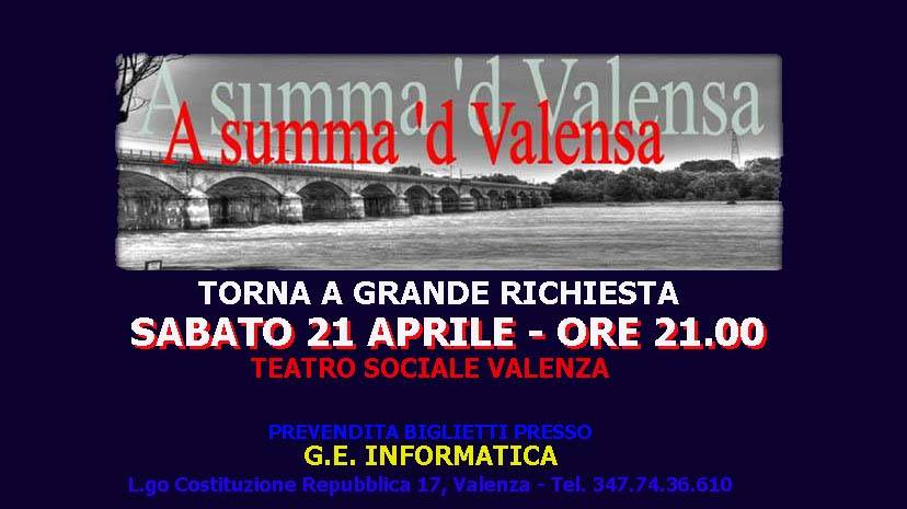 SABATO 21 APRILE 2018 AL TEATRO SOCIALE DI VALENZA andrà in scena a grande richiesta la replica dello spettacolo " A SUMMA 'D VALENSA" la prima commedia sulla nostra città scritta da Gianluca Pivetti e diretta da Agata Tinnirello. Un evento unico nel suo genere perché vedrà l'unione di due compagnie teatrali amatoriali, la compagnia "Notte magica" e il laboratorio teatrale "Ikeatrando".
