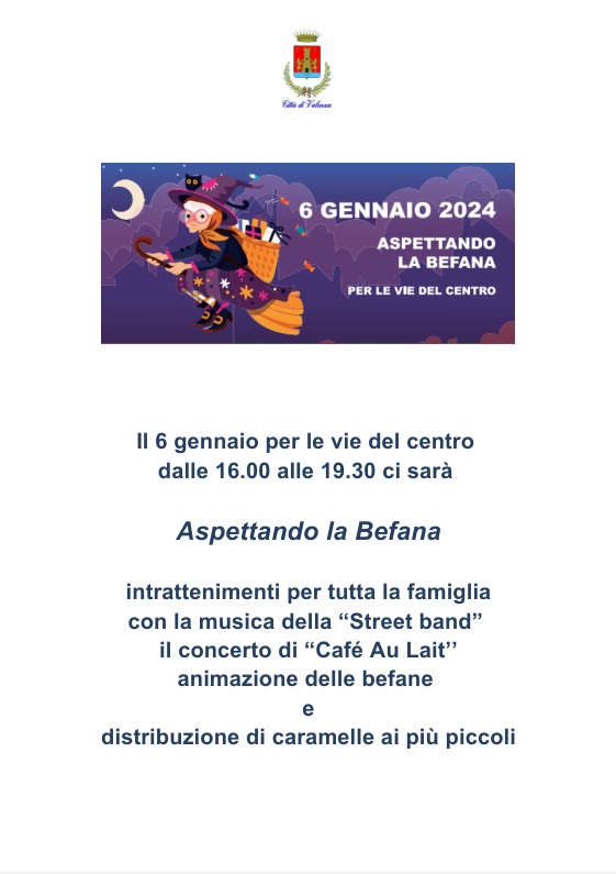 Intrattenimenti per tutta la famiglia con la musica della “Street band”, il concerto di “Café au Lait’’, animazione delle befane e distribuzione di caramelle ai più piccoli