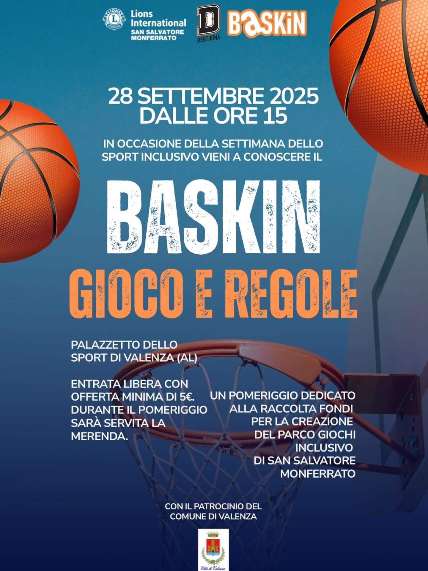Domenica 28 settembre a partire dalle ore 15:00 si terrà, presso il palazzetto dello sport di Valenza, la manifestazione "Baskin gioco e regole"