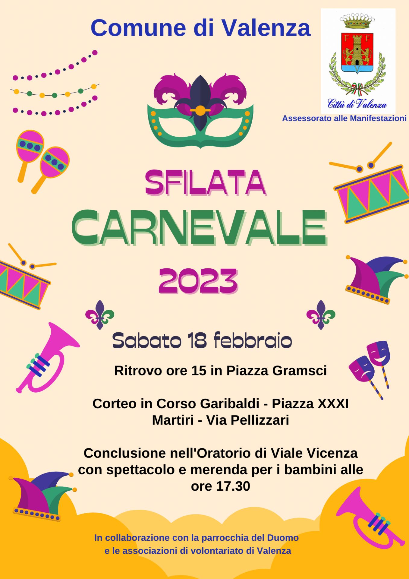 Sabato 18 febbraio 2023, a partire dalle ore 15.00 per le vie del centro storico di Valenza, si snoderà la sfilata di Carnevale organizzata dall’Assessorato alle Manifestazioni con la collaborazione della Parrocchia di Santa Maria Maggiore e delle associazioni di volontariato della città.