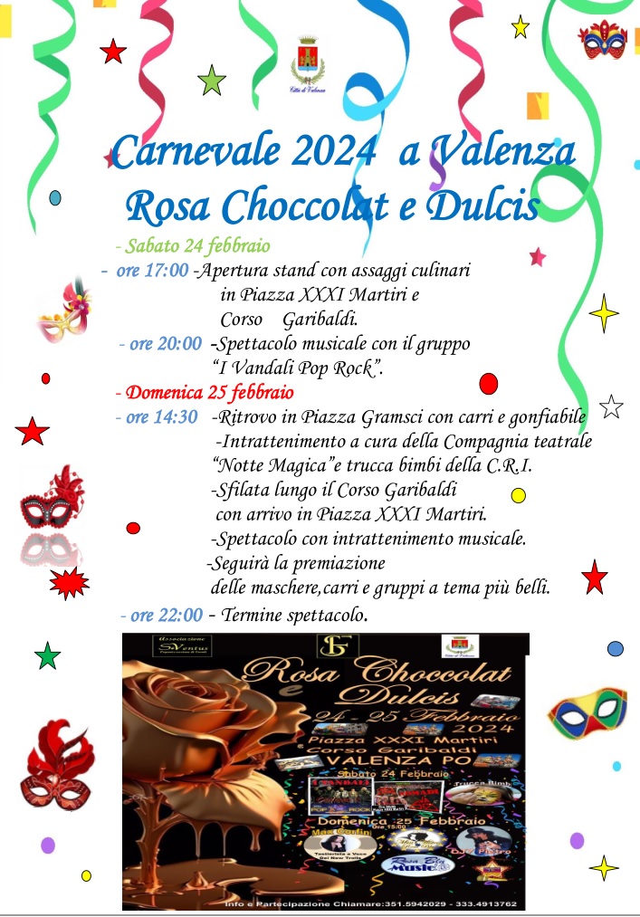 “Quest’anno a Valenza si festeggerà un Carnevale ricco di appuntamenti. La festa è dedicata a grandi e piccoli, una due giorni di musica e tanta allegria con la sfilata in costume e la premiazione delle maschere più belle della parata”. Così commentano il Sindaco Maurizio Oddone e l’Assessore ai Beni Culturali Alessia Zaio.