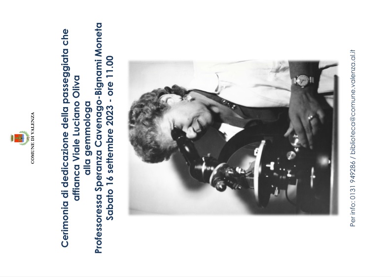 Sabato 16 settembre 2023 alle ore 11.00 in Viale Luciano Oliva avrà luogo la cerimonia con cui l’Amministrazione Comunale, su proposta del Professor Luciano Orsini, dedicherà la passeggiata che affianca Viale Luciano Oliva all’indimenticabile Professoressa Speranza Cavenago-Bignami Moneta, “Signora delle gemme” che in Valenza introdusse, all’inizio degli anni ’50 del XX secolo, lo studio della gemmologia e promosse la fondazione e l’attività del Laboratorio di Stato per le analisi gemmologiche.