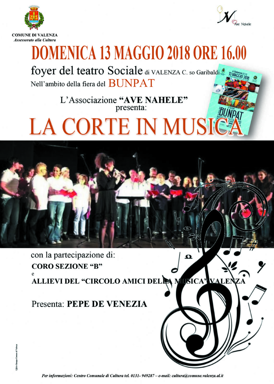 DOMENICA 13 MAGGIO ALLE ORE 16.00 presso il foyer del Teatro Sociale di Valenza, in Corso Garibaldi, l’Assessorato alla Cultura del Comune di Valenza insieme all’Associazione “Ave Nahele” di Alessandria, organizza l’esibizione musicale del “Coro Sezione B” dell’Associazione “Ave Nahele” e dei cori e allievi del Circolo “Amici della Musica P. Piacentini di Valenza”.
