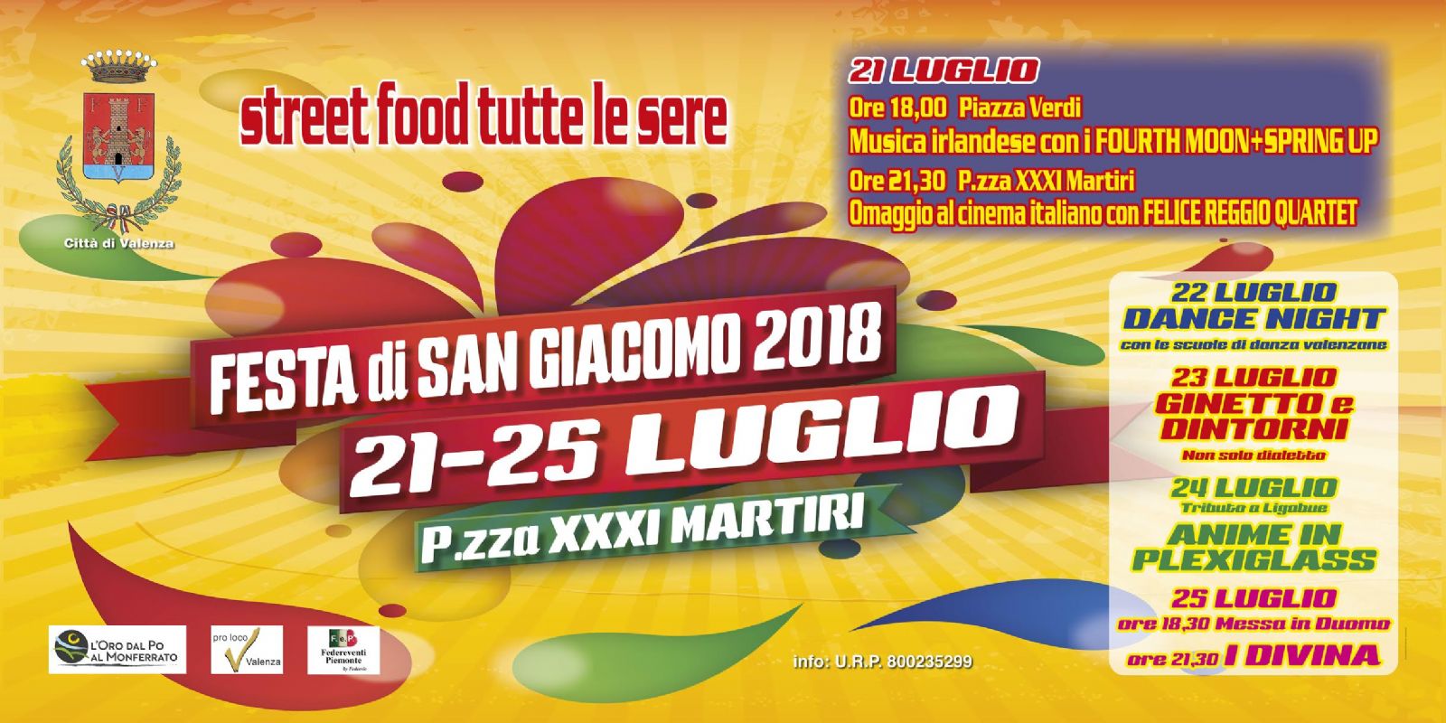 Vario ed attraente il programma della Festa di San Giacomo 2018, organizzata dal Comune di Valenza, Assessorato al Commercio e Turismo. Cinque serate dal 21 al 25 luglio.