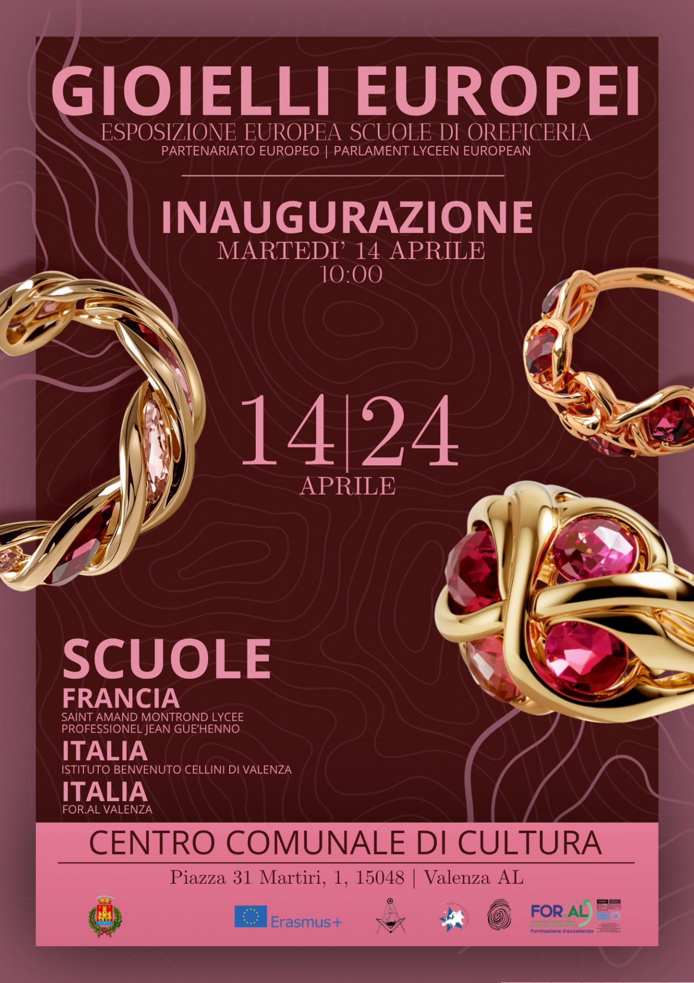 Dal 14 aprile sarà così possibile visitare presso il Centro Comunaledi Cultura la mostra “Gioielli Europei” che presenterà i gioielli realizzati dagli alunni delle scuole valenzane IIS “Benvenuto Cellini” e For.AL “Vincenzo Melchiorre” e dagli studenti provenienti da istituti francesi.