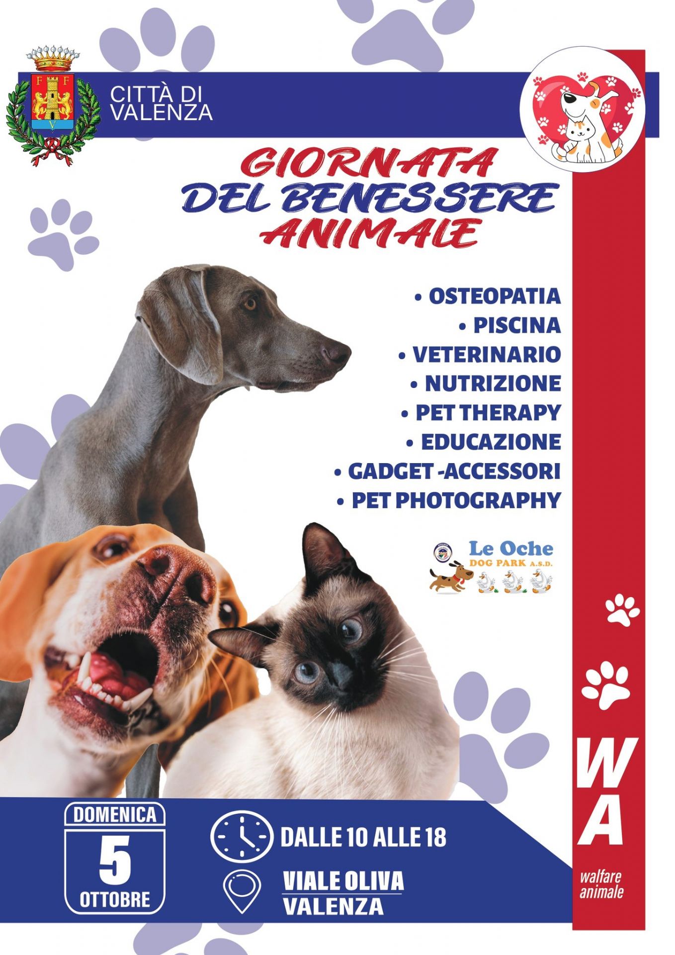 Domenica 5 ottobre, in Viale Oliva, a partire dalle ore 10,00, per la GIORNATA DEL BENESSERE ANIMALE alcune associazioni e professionisti del territorio metteranno a disposizione la propria professionalità per gli animali di affezione dei cittadini valenzani.