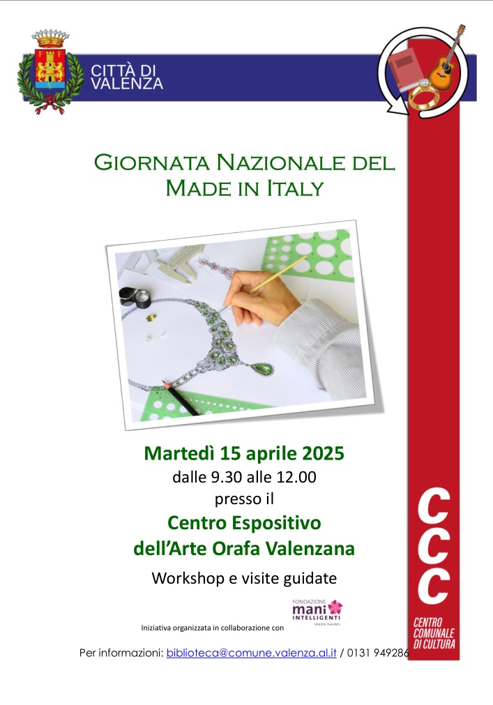 In occasione della Giornata nazionale del Made in Italy, martedì 15 aprile 2025 dalle 9.30 alle 12.00, il Comune di Valenza, in collaborazione con la Fondazione Mani Intelligenti, organizza workshop e visite guidate alle sezioni permanenti di gemmologia, grafica e MOD (Museo dell'Oreficeria Diffuso) presso la sede del Centro Espositivo dell’Arte Orafa Valenzana.