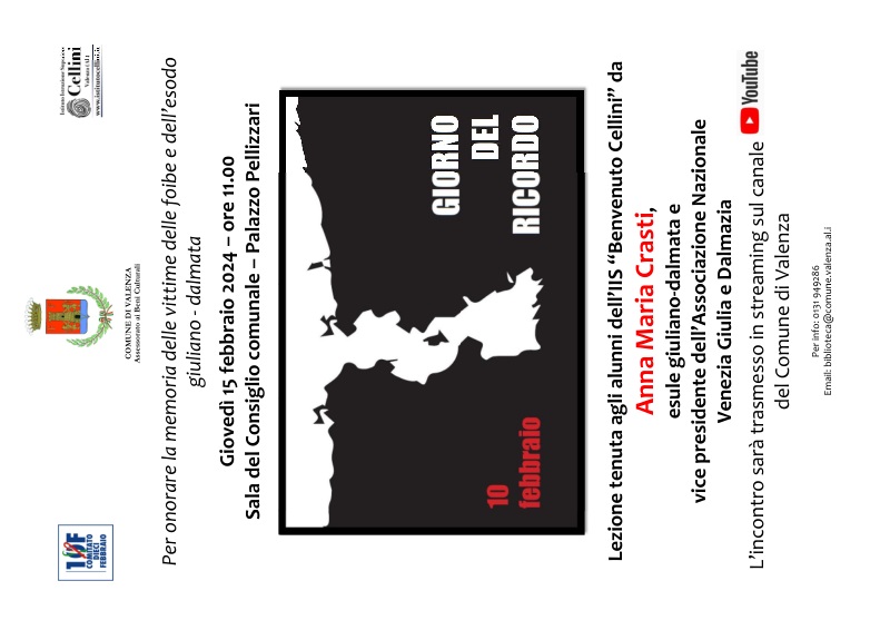 Giovedì 15 febbraio alle ore 11:00, In occasione della celebrazione del "Giorno del ricordo" presso la Sala del Consiglio Comunale - Palazzo Pellizzari Anna Maria Crasti, vice presidente dell'Associazione Nazionale Venezia Giulia e Dalmazia, terrà una lezione agli alunni del'''IIS "Benvenuto Cellini" in memoria delle vittime delle foibe e dell'esodo giuliano - dalmata.