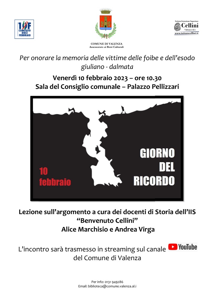 Per onorare la memoria delle vittime delle foibe e dell’esodo giuliano - dalmata il Comune di Valenza, in collaborazione con l’IIS “Benvenuto Cellini”, organizza per venerdì 10 febbraio alle ore 10.30 nella Sala del Consiglio Comunale di Palazzo Pellizzari una lezione di storia incentrata sull’eccidio delle foibe a cura dei docenti Alice Marchisio e Andrea Virga. All’incontro saranno presenti alcune classi dell’Istituto “Benvenuto Cellini” che potranno intervenire con domande e riflessioni a conclusione della lezione.