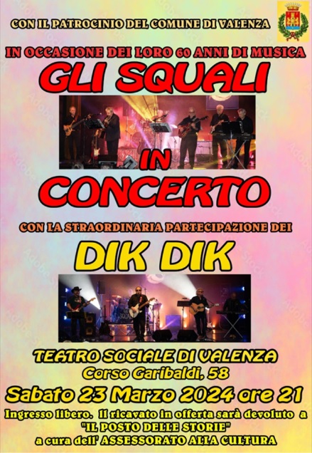 Sabato 23 marzo alle ore 21.00 presso il Teatro Sociale di Valenza, in occasione dei sessant’anni di musica, la cover band alessandrina Gli Squali festeggerà l’anniversario con un concerto che vedrà anche la partecipazione straordinaria del gruppo Dik Dik.