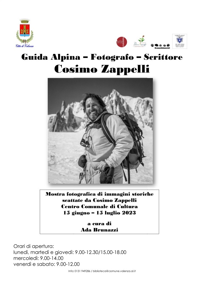 «Il fascino della montagna, dell’avventura, della sfida con se stessi e con le difficoltà, la preparazione fisica e mentale, il grande rigore a questo ci porta a pensare la figura di Cosimo Zappelli. Grazie alla concessione del prestito del Comune di La Salle, che ha promosso l’iniziativa in Valle D’Aosta, siamo lieti di ospitare questa mostra negli spazi del Centro Comunale di Cultura di Valenza. Una figura, quella di Zappelli, da conoscere e riscoprire anche come simbolo del rispetto per la montagna e per la natura» così commentano il Sindaco Maurizio Oddone e l’Assessore ai Beni Culturali Alessia Zaio.