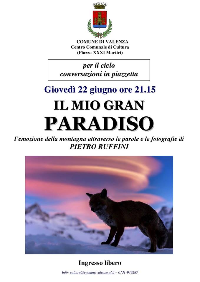 Giovedì 22 Giugno alle ore 21.15 per il ciclo “CONVERSAZIONI IN PIAZZETTA” presso il Centro Comunale di Cultura di Valenza, avrà luogo un incontro dal titolo “Il mio Gran Paradiso l'emozione della montagna attraverso le parole e le fotografie di PIETRO RUFFINI”.