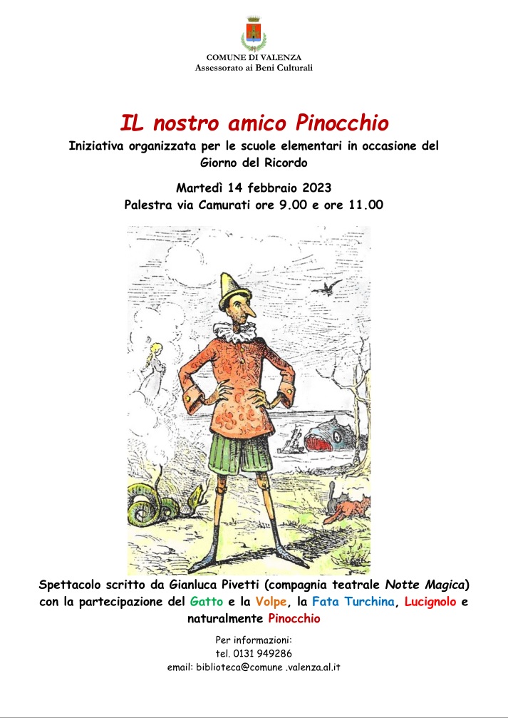 In occasione del Giorno del Ricordo, solennità civile nazionale italiana commemorata il 10 febbraio di ogni anno, l’Assessorato ai Beni Culturali, in collaborazione con il Dirigente scolastico delle scuole primarie statali di Valenza, organizza e promuove, martedì 14 febbraio 2023, lo spettacolo Il nostro amico Pinocchio.