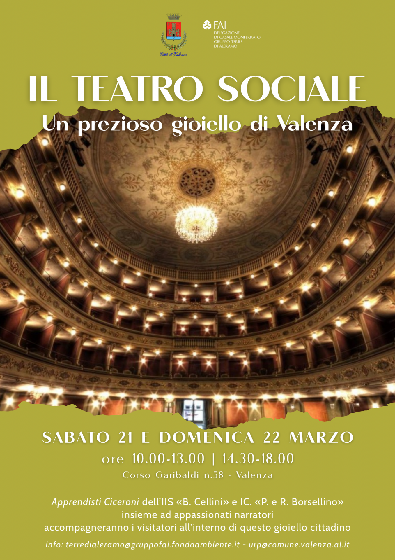 In occasione delle Giornate FAI di Primavera, il Teatro Sociale ospiterà visite guidate a cura degli Apprendisti Ciceroni delle scuole IC “Paolo e Rita Borsellino” e IIS “Benvenuto Cellini”, in collaborazione con il Gruppo FAI "Terre di Aleramo" di Casale Monferrato.