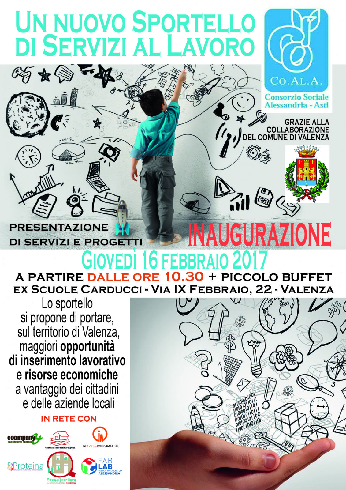 Il 16/02/2017 è prevista l'inaugurazione del nuovo sportello, sito nelle ex Scuole Carducci in Via IX Febbraio, 22 - Valenza, in occasione della quale verranno presentati i servizi che sarà possibile erogare e i progetti che si stanno gestendo.