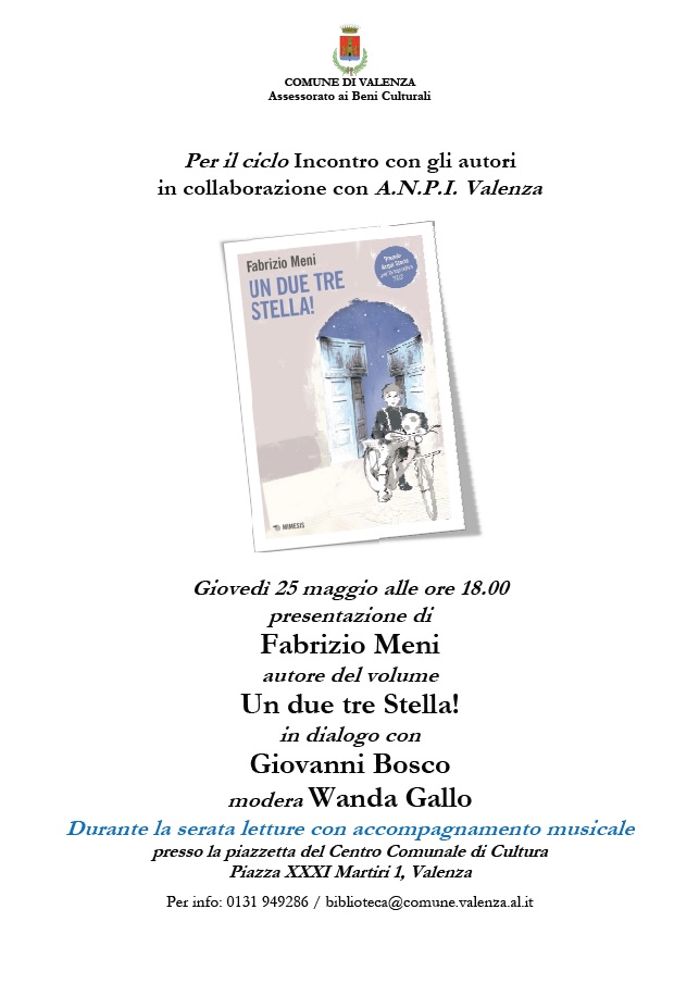 Giovedì 25 maggio alle ore 18.00 Palazzo Valentino ospiterà l’ultimo appuntamento del mese di maggio del ciclo Incontro con gli autori. L’incontro, organizzato in collaborazione con A.N.P.I Valenza, vedrà protagonista lo scrittore Fabrizio Meni che presenterà il libro Un due tre Stella! (ed. Mimesis 2022).