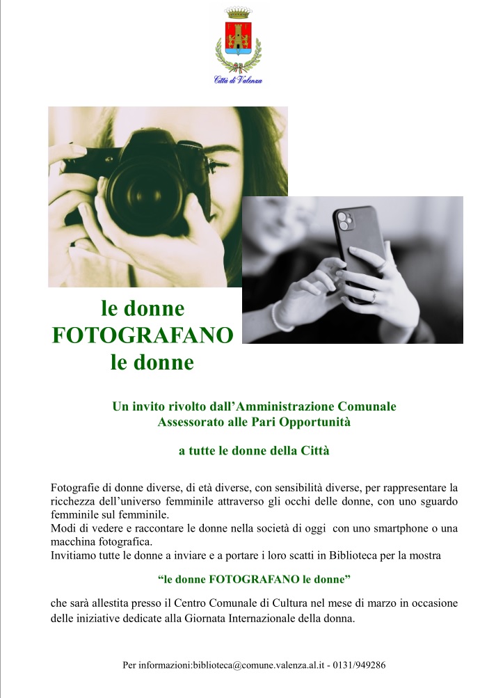 Sono invitate tutte le donne a inviare e a portare i loro scatti presso la sede della Biblioteca civica per la mostra le donne FOTOGRAFANO le donne che sarà allestita presso il Centro Comunale di Cultura nel mese di marzo in occasione delle inizative dedicate alla Giornata Internazionale della donna.