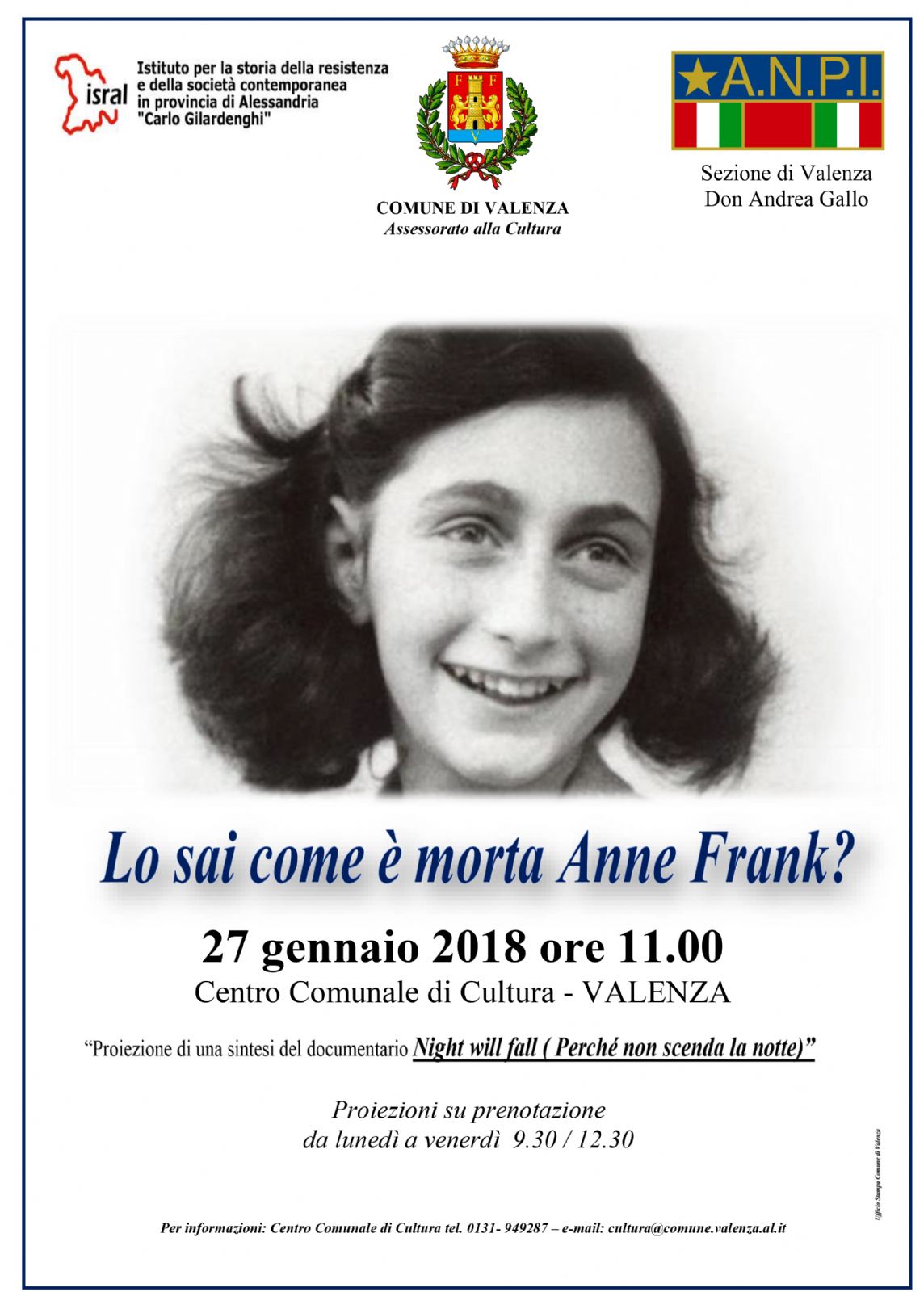 Alle ore 11.00 presso il Centro Comunale di Cultura di Valenza, in occasione del "Giorno della Memoria", avrà luogo la proiezione di una sintesi del documentario "Night will fall. (Perchè non scenda la notte)".
