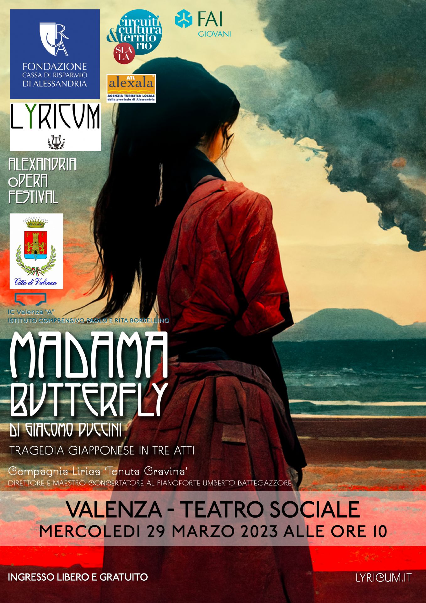 Il 29 marzo, alle ore 10.00, presso il Teatro Sociale di Valenza si terrà la rappresentazione della celebre opera di Giacomo Puccini Madama Butterfly, interpretata dalla compagnia lirica della Tenuta Cravina, realtà alessandrina nata per riportare in auge l'interesse per l'opera lirica in un territorio che ha espresso in passato grandi interpreti internazionali.