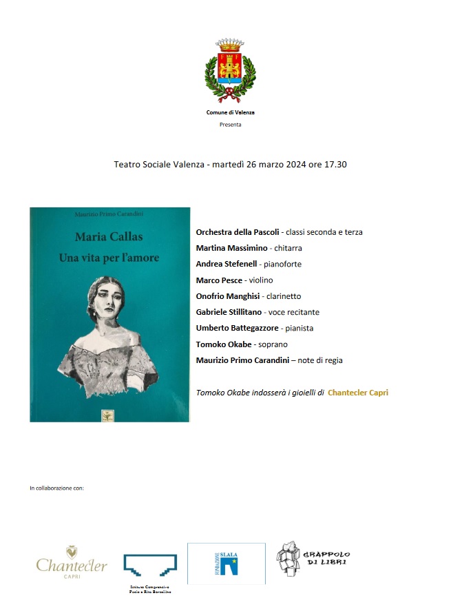 Martedì 26 marzo alle ore 17.30 presso il Teatro Sociale di Valenza sarà presentato il libro “Maria Callas – Una vita per l’amore”, scritto da Maurizio Primo Carandini, Dirigente scolastico dell’Istituto comprensivo “Paolo e Rita Borsalino”.