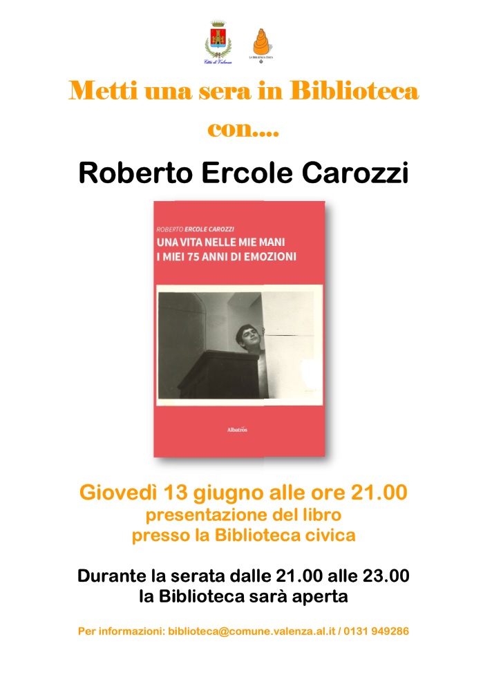 Giovedì 13 giugno alle ore 21.00 l’appuntamento sarà con l’autore Roberto Ercole Carozzi che presenterà il racconto “Un vita nelle mie mani. I miei 75 anni di emozioni” (Albatros 2023).