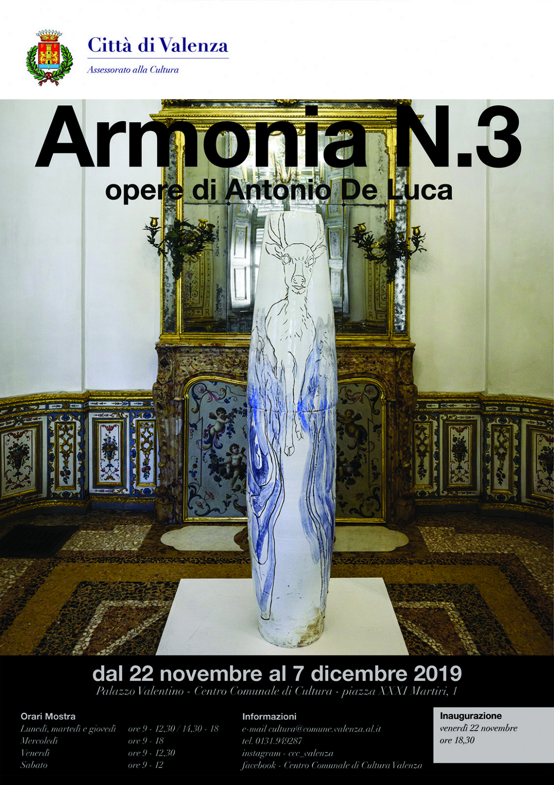 Inaugurerà venerdì 22 novembre 2019 alle ore 18.30 presso Palazzo Valentino – Centro Comunale di Cultura la mostra ARMONIA N.3 dell’artista ANTONIO DE LUCA. Una personale tutta dedicata ai lavori dell’ultimo anno che comprendono oli, acquerelli e ceramiche. La mostra sarà visitabile fino a sabato 7 settembre 2019.