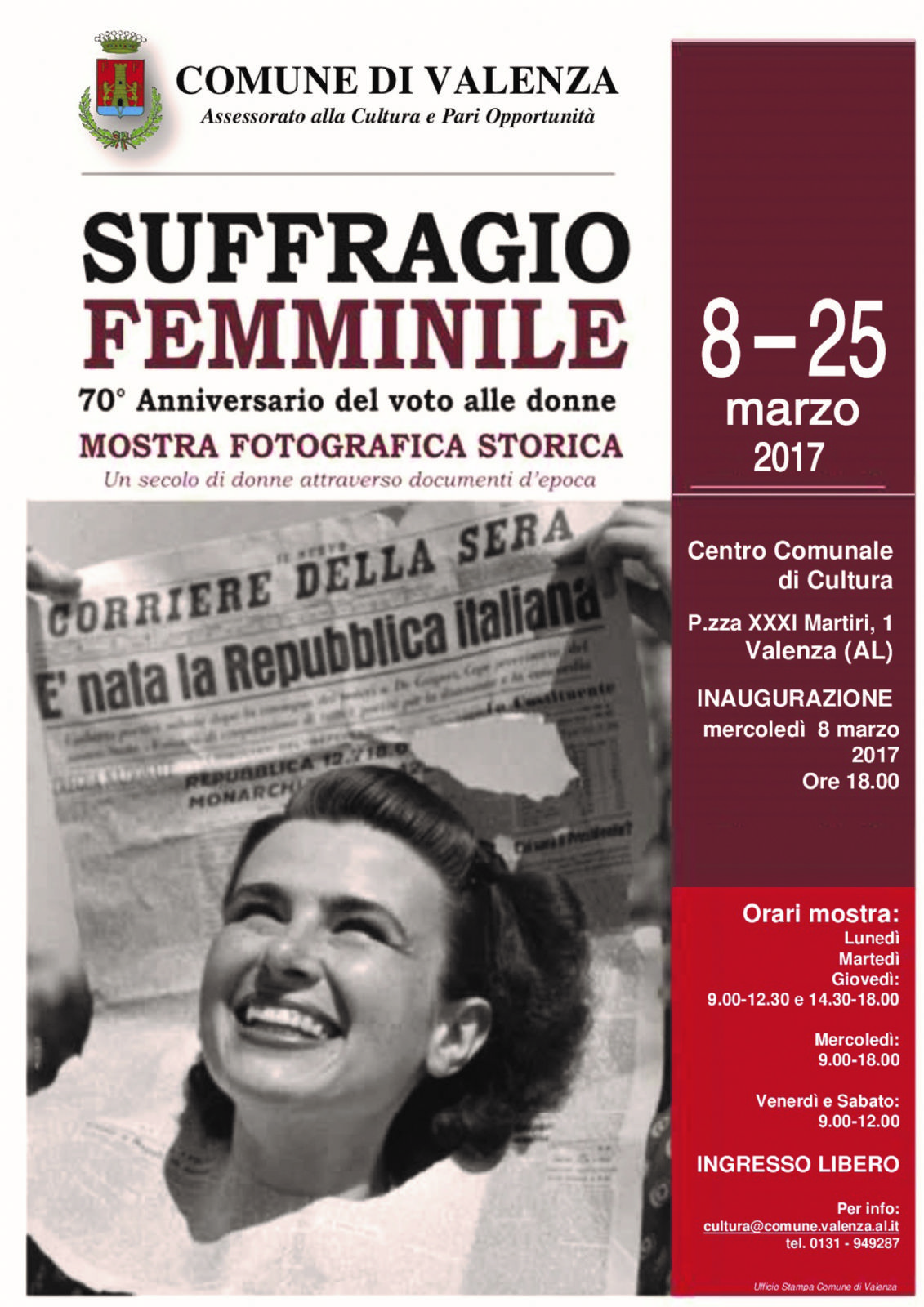 Mercoledì 8 Marzo alle ore 18.00 verrà inaugurata al Centro Comunale di Cultura di Valenza in P.zza XXXI Martiri la mostra fotografica “Suffragio Femminile. 70° Anniversario del voto alle donne”.