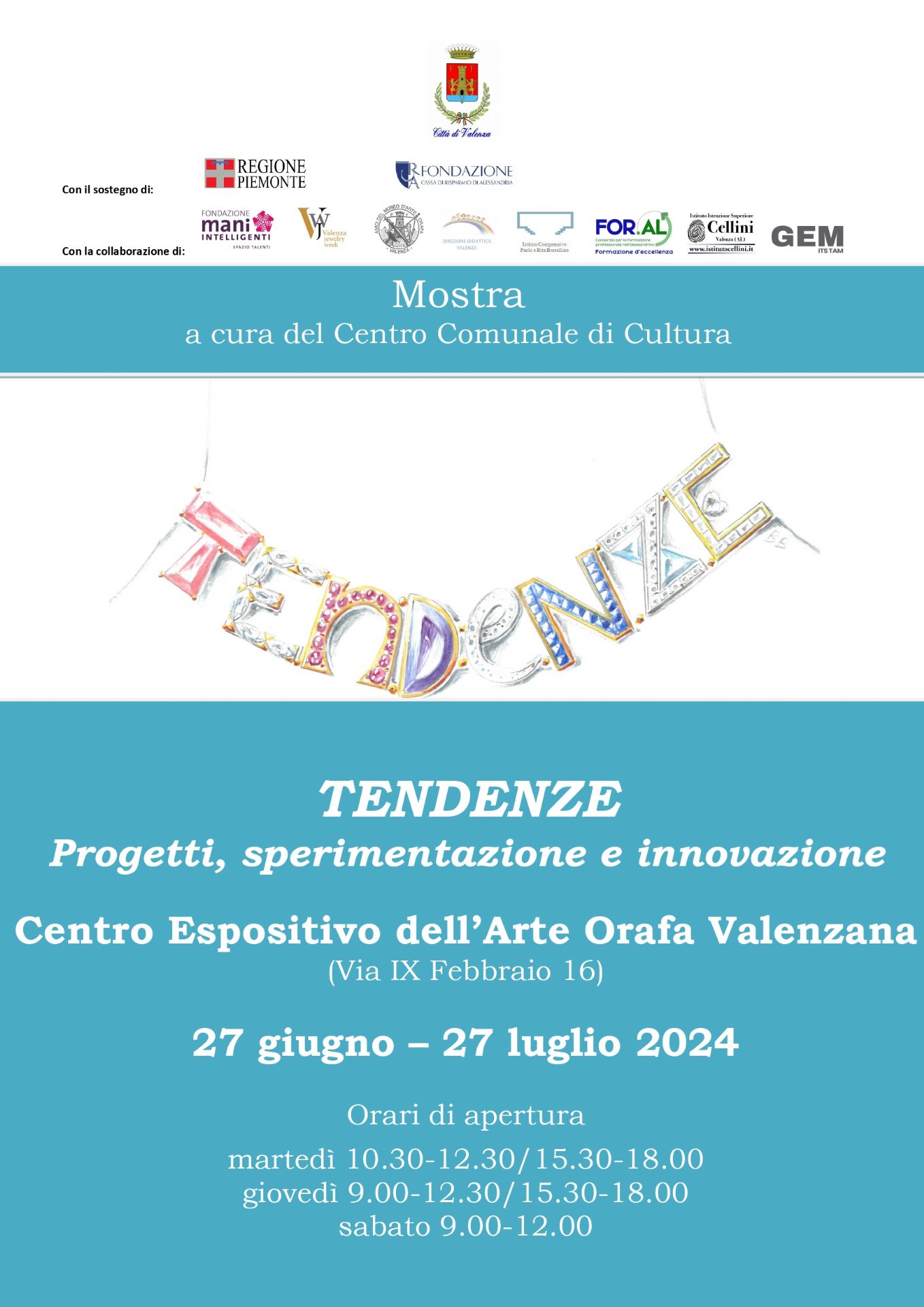 Dopo aver ospitato, in occasione della “Valenza Jewelry Week”, l’esposizione dedicata alla prestigiosa tradizione orafa di Valenza rappresentata da alcune delle aziende storiche del distretto, dal 27 giugno al 27 luglio presso il Centro Espositivo sarà allestita la mostra “Tendenze”, a cura del Centro Comunale di Cultura. L’iniziativa espositiva coinvolgerà tutte le scuole attive nel distretto orafo valenzano ponendo il focus sulla contemporaneità, sulla creatività e sull’estro dei giovani talenti che si stanno formando presso i vari istituti cittadini. Il “saper fare” e il “saper immaginare” sono i criteri guida che hanno condotto alla selezione delle creazioni orafe che saranno proposte in mostra, creazioni che sono il frutto di una ricerca improntata alla qualità alla sperimentazione e all’innovazione.