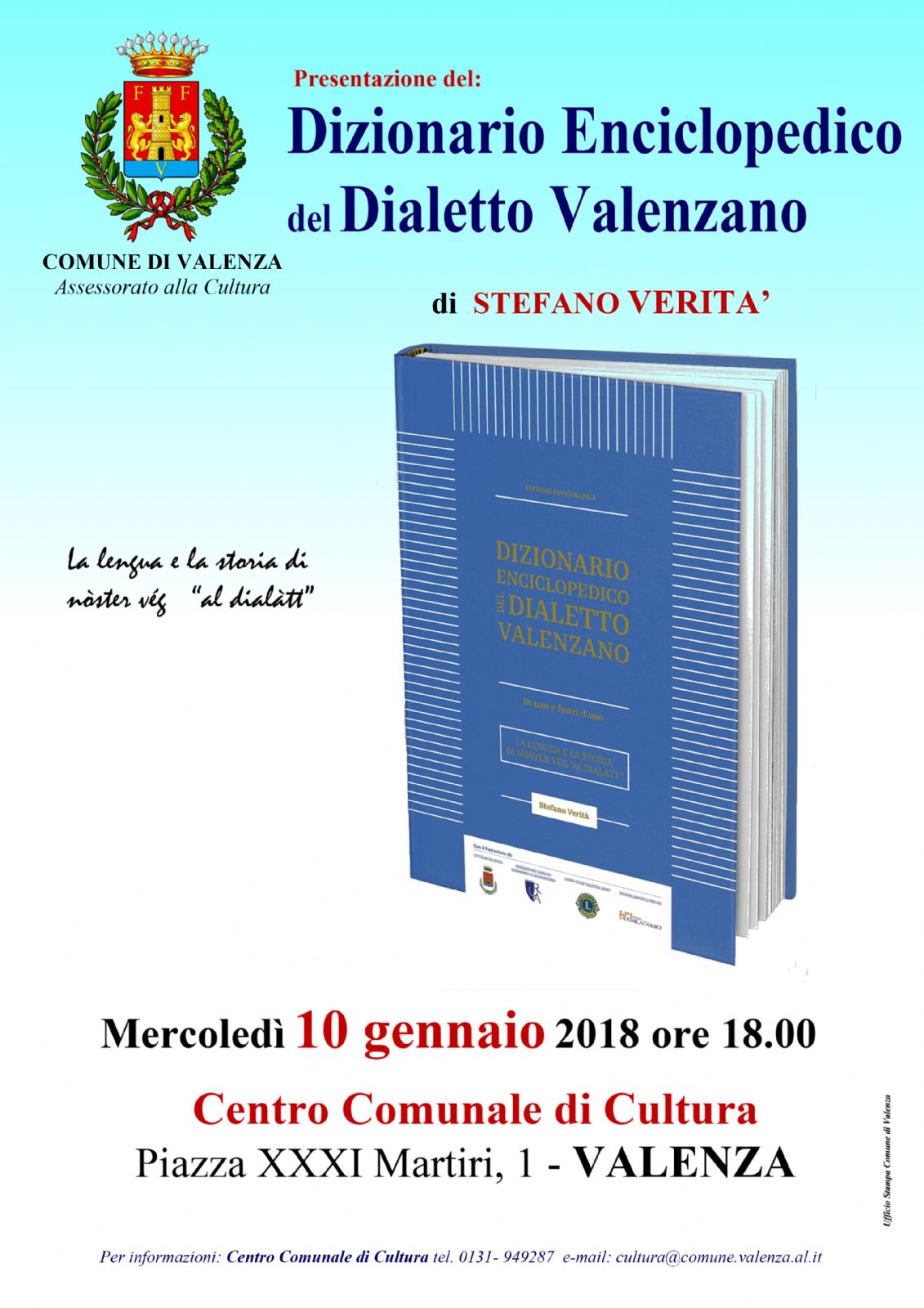 Mercoledì 10 gennaio alle 18, al Centro Comunale di Cultura di Valenza in piazza XXXI Martiri, verrà presentato il