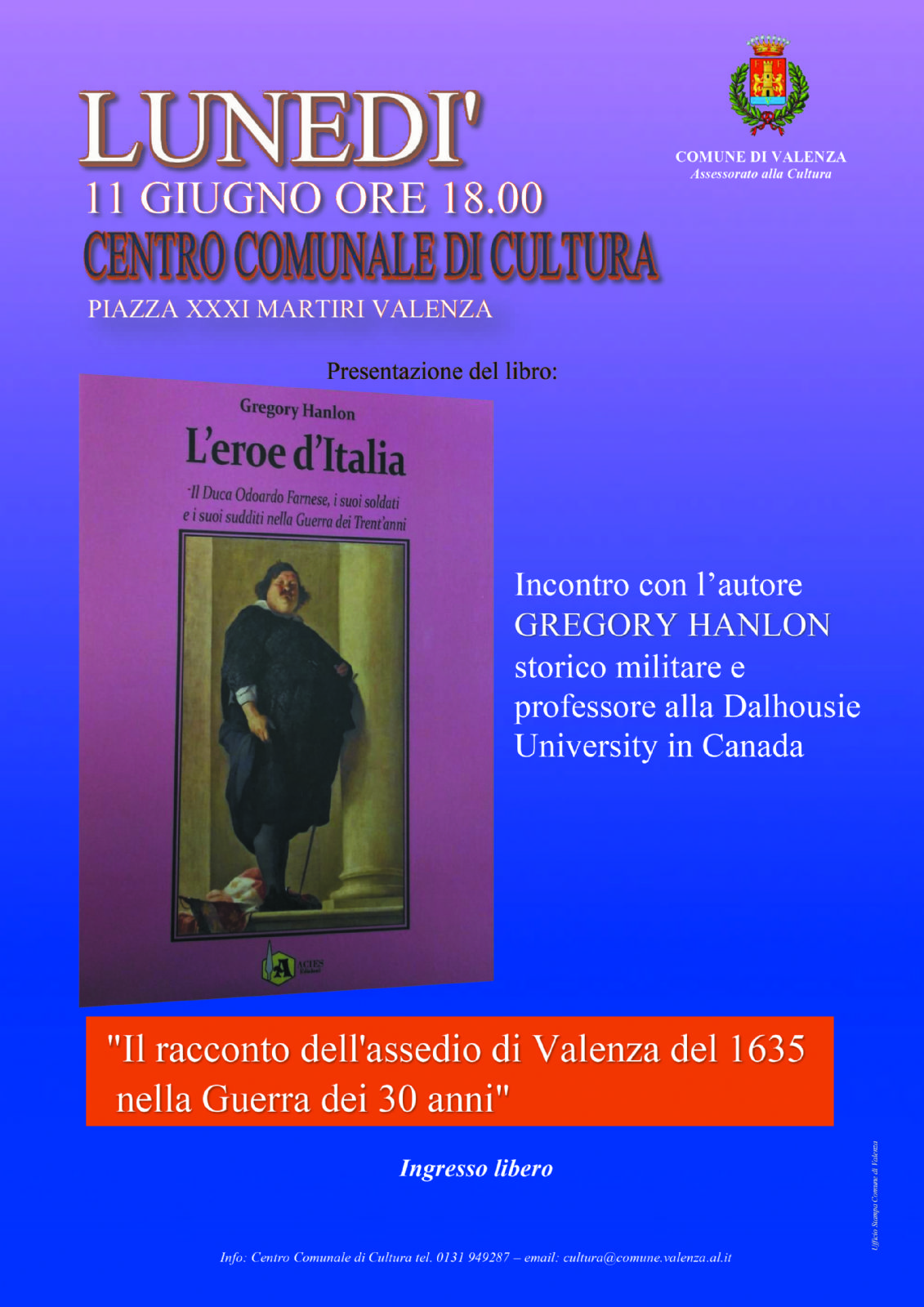 Lunedì 11 Giugno alle ore 18.00 presso il Centro Comunale di Cultura di Valenza avrà luogo la presentazione del libro "L'eroe d'Italia" a cura dell'autore Gregory Hanlon, storico militare e professore alla Dalhousie University in Canada.