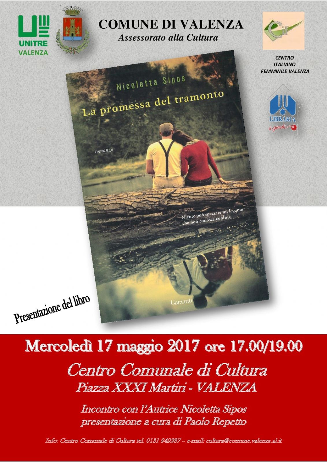 Mercoledì 17 Maggio alle ore 17.00 presso il Centro Comunale di Cultura, avrà luogo la presentazione del libro "La promessa del tramonto" a cura dell'autrice Nicoletta Sipos. Presenta Paolo Repetto.