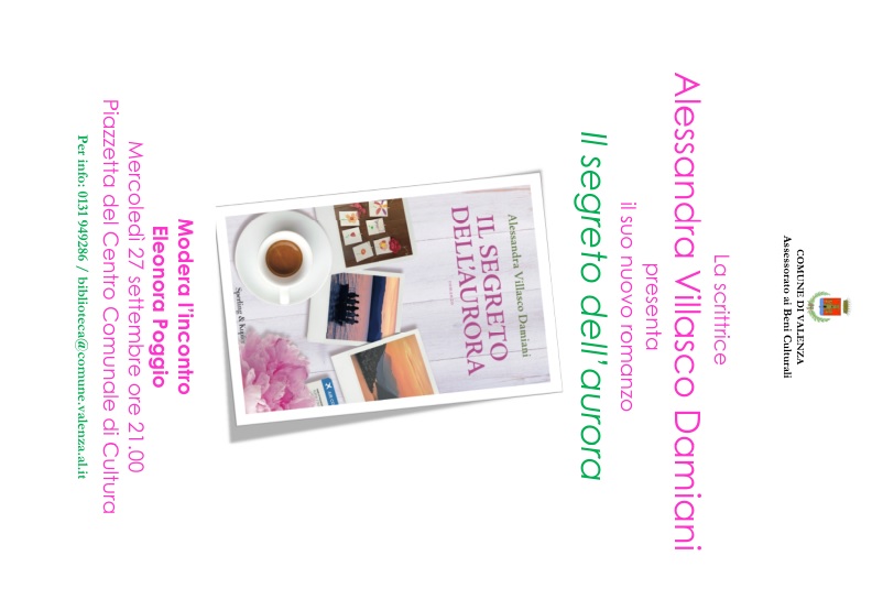 Mercoledì 27 settembre alle ore 21.00 presso la Piazzetta del Centro Comunale di Cultura di Valenza (Piazza XXXI Martiri 1) la scrittrice Alessandra Villasco Damiani presenterà il suo nuovo romanzo dal titolo “Il segreto dell’aurora”, edito da Sperling & Kupfer.