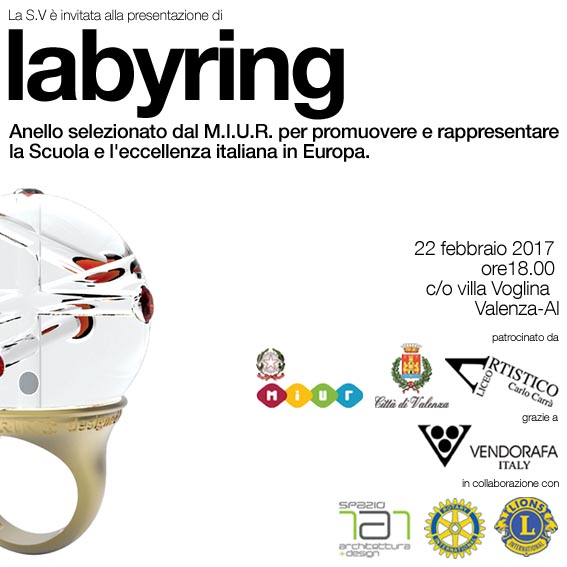 Mercoledì 22 febbraio, alle ore 18.00, nell’elegante cornice della villa “La Voglina” si terrà la presentazione del gioiello “Labyryng”, realizzato dagli allievi del Liceo Artistico “Carlo Carrà” di Valenza e selezionato dal M.I.U.R. per rappresentare e promuovere la scuola di design e l’eccellenza italiana in Europa, di cui il “Carrà” è un importante esempio.