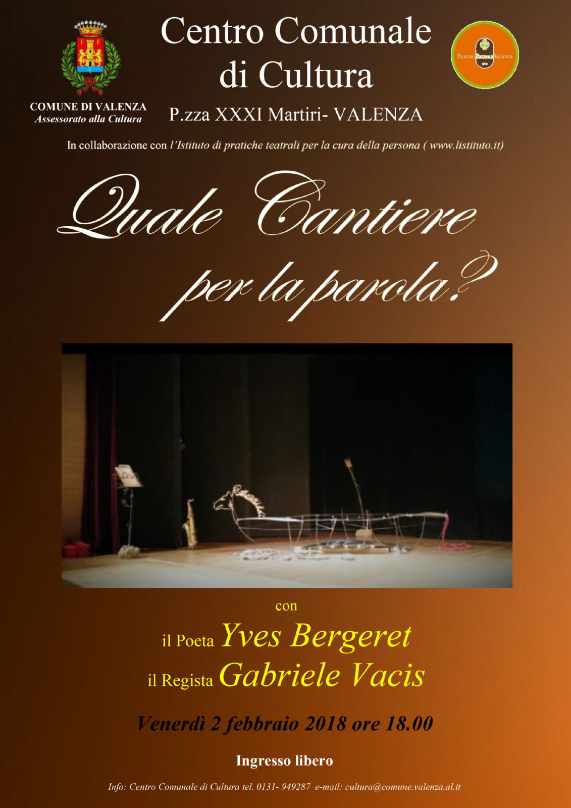 Venerdì 2 febbraio alle ore 18.00 presso il centro Comunale di Cultura di Valenza avrà luogo una conversazione tra il poeta YVES BERGERET e regista GABRIELE VACIS sull'uso della parola poetica come legame tra i popoli.