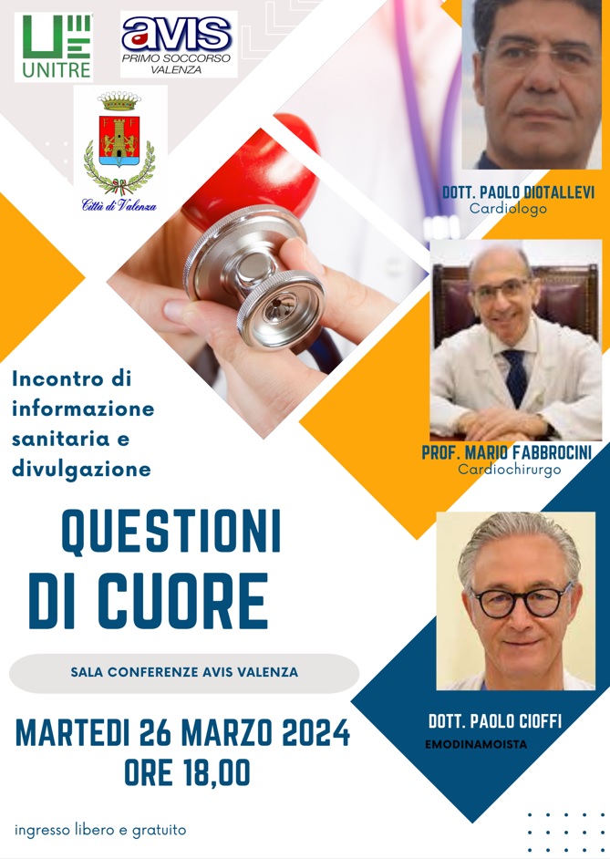 Con il patrocinio del Comune di Valenza e la collaborazione di Avis Primo Soccorso, la Sede Unitre di Valenza organizza un incontro di informazione sanitaria e di divulgazione a tema cardiologico che si terrà MARTEDI 26 MARZO ALLE ORE 18:00 presso la Sala conferenze Avis di Viale Manzoni.