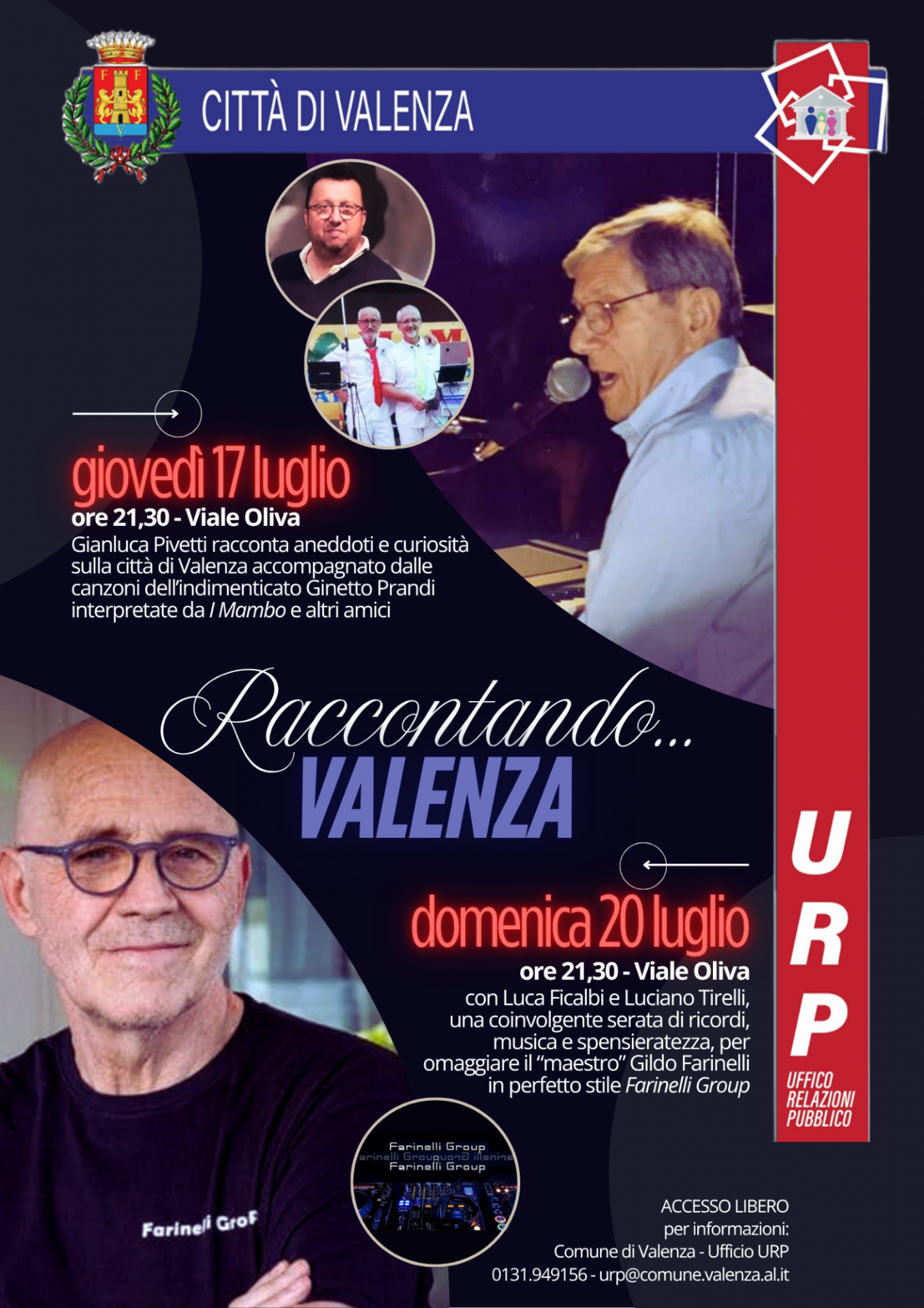Il primo appuntamento è giovedì 17 luglio con Gianluca Pivetti che, come un moderno cantastorie, racconterà curiosità e aneddoti sulla storia di Valenza e dei suoi “illustri” personaggi, più o meno conosciuti, accompagnato dalle celebri canzoni dell’indimenticato Ginetto Prandi, cantore della valenzanità scomparso nel 2015, eseguite da I Mambo e altri amici.